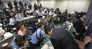4月26日,在日本東京,日本三菱汽車公司社長(zhǎng)相川哲郎(右中)出席記者會(huì)時(shí)鞠躬。三菱汽車上周承認(rèn),該公司有四款微型汽車在燃油經(jīng)濟(jì)性測(cè)試中存在違規(guī)操作,以美化排放水平?!⌒氯A社/美聯(lián)? |