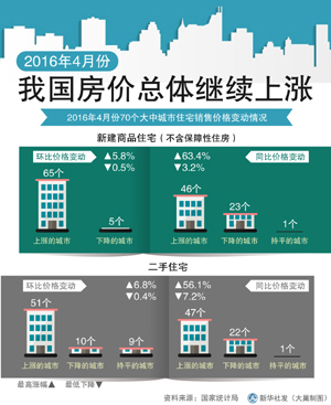 國家統(tǒng)計局城市司高級統(tǒng)計師劉建偉表示,無論從上漲城市數(shù)量還是漲幅都可以看出,房價整體在上漲。發(fā)布的數(shù)據(jù)顯示,4月70個大中城市新建商品住宅價格環(huán)比上漲的城市有65個,比上月增加3個,下降的城市有5個,比上月減少3個;環(huán)比漲幅在1%以上的城市有22個,比上月增加4個,環(huán)比漲幅在5%以上的城市有2個,比上月增加1個;最高漲幅為5.8%,比上月擴大0.4個百分點。