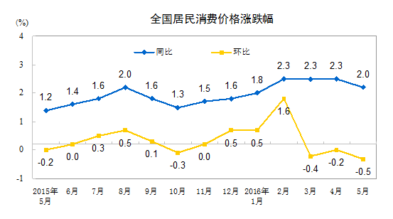 2016年5月份,全國(guó)居民消費(fèi)價(jià)格總水平同比上漲2.0%。其中,城市上漲2.0%,農(nóng)村上漲2.1%;食品價(jià)格上漲5.9%,非食品價(jià)格上漲1.1%;消費(fèi)品價(jià)格上漲2.0%,服務(wù)價(jià)格上漲2.1%。1-5月平均,全國(guó)居民消費(fèi)價(jià)格總水平比去年同期上漲2.1%。