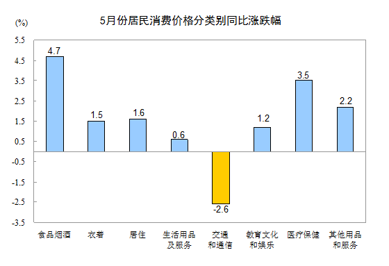 5月份,其他七大類價(jià)格同比六漲一降。其中,醫(yī)療保健、其他用品和服務(wù)、居住、衣著、教育文化和娛樂(lè)、生活用品及服務(wù)價(jià)格分別上漲3.5%、2.2%、1.6%、1.5%、1.2%、0.6%;交通和通信價(jià)格下降2.6%。