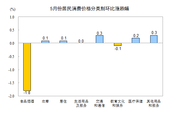 5月份,全國(guó)居民消費(fèi)價(jià)格總水平環(huán)比下降0.5%。其中,城市下降0.5%,農(nóng)村下降0.4%;食品價(jià)格下降2.7%,非食品價(jià)格上漲0.1%;消費(fèi)品價(jià)格下降0.7%,服務(wù)價(jià)格持平。