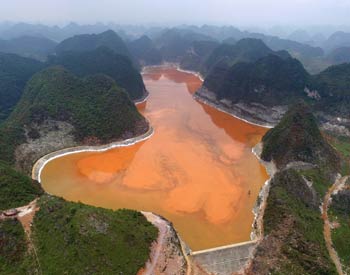 ?這是記者近日航拍的廣西華銀鋁業(yè)有限公司龍山排泥庫。該庫庫容2293萬立方米,相當于40多個北京北海的容量。尾礦庫長期堆存于青山間,不僅污染著生態(tài),更在2008年至2012年的4年間,先后發(fā)生9次泄漏,靖西境內(nèi)眾多村民房屋被淹,大量農(nóng)田被毀。記者 周華/攝 |