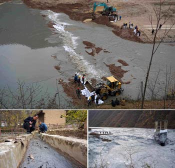 ?這是記者拍攝的甘肅省隴南市西和縣隴星銻業(yè)公司尾礦庫泄漏事故救援現(xiàn)場。流經(jīng)西和縣的太石河因尾礦泄漏成了環(huán)保事件中有名的“水泥河”。 2015年11月,隴星銻業(yè)公司尾礦庫二號溢流井隔板破損出現(xiàn)漏沙約3000立方米,經(jīng)太石河流入西漢水,造成涉及甘肅、陜西、四川三省的重大突發(fā)環(huán)境事件。記者 黃文新/攝 ? |