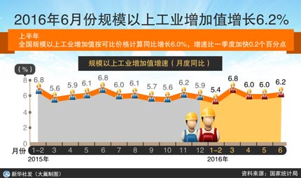 受穩(wěn)增長政策、企業(yè)效益改善等因素影響,今年以來工業(yè)生產(chǎn)改變了過去增速持續(xù)放緩態(tài)勢,出現(xiàn)一定企穩(wěn)跡象。國家統(tǒng)計局?jǐn)?shù)據(jù)顯示,上半年,全國規(guī)模以上工業(yè)增加值同比增長6%,增速與上年基本持平。從近四個季度增長情況看,2015年三、四季度工業(yè)生產(chǎn)增速均為5.9%,今年一、二季度分別增長5.8%和6.1%,連續(xù)四個季度保持在6%左右的區(qū)間內(nèi)小幅波動,終止了工業(yè)增速連續(xù)下滑的趨勢。