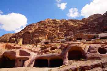 第二天早上9點,在花了將近500人民幣的門票代價后,我們順利進入佩特拉古城。果然,剛剛進入就是一片片略帶有粉紅色的巖石山脈,石頭上星星散散刻著一些圖案。這條峽谷兩旁巖壁上出現(xiàn)很多空洞,據(jù)說是鑿巖而成的墓碑群。這些墓碑群根據(jù)所有者身份的不同而規(guī)格不一,雕刻的圖案也各不相同。在這里,那時的人們同樣相信復(fù)活,會在生前為自己建造死后的歸屬。