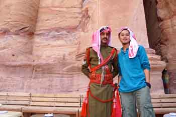 我在路邊小攤上買下了一塊具有阿拉伯風格的頭巾,也被當?shù)厝死嬌狭藷熝b,我想,就讓我做一天約旦人,去融入這玫瑰之城,去體味這千年的時光足印。