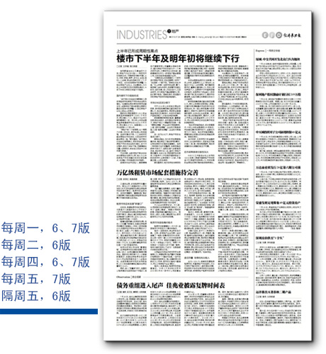 周一 6版:能源 7版:環(huán)保 周二 6版:物流 周三(隔周) 6版:3C 7版:E商 周四 6版:汽車(chē) 7版:地產(chǎn) 周五 6版:互聯(lián)網(wǎng)+ 7版:健康