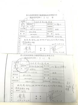 土地檔案中《國有土地使用權(quán)出讓審批卡片》與劉聚川提供的原件復(fù)印件對比。記者 朱旭東/攝? |