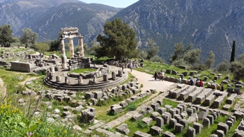 在距雅典150公里的帕那索斯深山里,有一處世界聞名的著名古跡,被稱為“地球的肚臍”的德爾菲。這里主要由阿波羅太陽神廟、雅典女神廟、劇場、體育訓(xùn)練場和運(yùn)動場組成,其中最有名的是古代希臘象征光明和青春并且主管音樂、詩歌及醫(yī)藥、畜牧的太陽神阿波羅的神廟。古希臘人認(rèn)為,德爾菲是地球的中心,是“地球的肚臍”。宙斯為了確定地球的中心在哪里,從地球的兩極放出兩只神鷹相對而飛。兩只鷹在德爾菲相會,宙斯斷定這里是地球的中心,于是將一塊圓形石頭放在德爾菲,作為標(biāo)志。如今這塊石頭就珍藏在德爾菲博物館里。