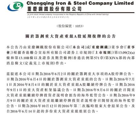 重慶鋼鐵11月1日發(fā)布公告稱,鑒于本次重組所涉及的資產(chǎn)規(guī)模較大,方案論證復(fù)雜;且為重大無先例事項,涉及到的具體問題正在向相關(guān)監(jiān)管部門進行咨詢,且方案的實施尚需取得多個監(jiān)管部門的批準(zhǔn)和認(rèn)可,公司預(yù)計無法于2016年11月2日復(fù)牌。公司自2016年11月2日開市起繼續(xù)停牌,繼續(xù)停牌時間不超過六個月。