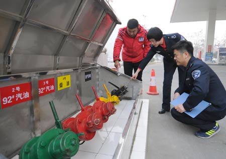 圖為12月18日,河北省邢臺市環(huán)保局執(zhí)法人員在橋西區(qū)一家加油站檢查油氣回收設施。新華社記者 朱旭東/攝