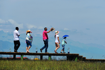 ??? 幾位游客在甘肅省肅南縣裕固族風情走廊上感受草原風情。記者 陳斌 攝 |