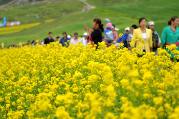 ??? 游客在扁都口生態(tài)景區(qū)觀賞萬畝油菜花海。記者 陳斌 攝 |