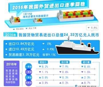 海關(guān)總署新聞發(fā)言人黃頌平表示,2016年全球經(jīng)濟(jì)仍處于國(guó)際金融危機(jī)后的深度調(diào)整期,經(jīng)濟(jì)復(fù)蘇乏力,國(guó)際市場(chǎng)需求疲弱,我國(guó)對(duì)外貿(mào)易發(fā)展面臨的不確定因素明顯增多,下行壓力加大,總體形勢(shì)復(fù)雜嚴(yán)峻。隨著國(guó)家促進(jìn)外貿(mào)回穩(wěn)向好政策措施效果的逐步顯現(xiàn),一季度我國(guó)外貿(mào)進(jìn)出口值明顯下降,二季度出現(xiàn)企穩(wěn),三四季度持續(xù)實(shí)現(xiàn)正增長(zhǎng),全年呈現(xiàn)前低后高、穩(wěn)中向好的走勢(shì)。