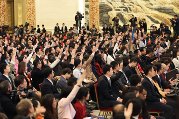 ??? 3月15日,國務(wù)院總理李克強在北京人民大會堂與中外記者見面,并回答記者提問。這是記者在舉手提問。新華社記者 金立旺 攝? |
