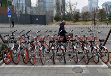 3月17日,在北京市石景山區(qū)銀河大街,共享單車整齊有序地停放在共享單車推薦停車點(diǎn)。 新華社記者 張晨霖 攝? |