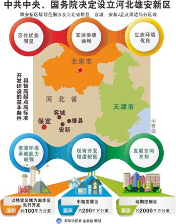 中共中央、國務院印發(fā)的通知稱,河北雄安新區(qū)規(guī)劃范圍涉及河北省雄縣、容城、安新三縣及周邊部分區(qū)域,地處北京、天津、保定腹地,區(qū)位優(yōu)勢明顯、交通便捷通暢、生態(tài)環(huán)境優(yōu)良、資源環(huán)境承載能力較強,現有開發(fā)程度較低,發(fā)展空間充裕,具備高起點高標準開發(fā)建設的基本條件。
