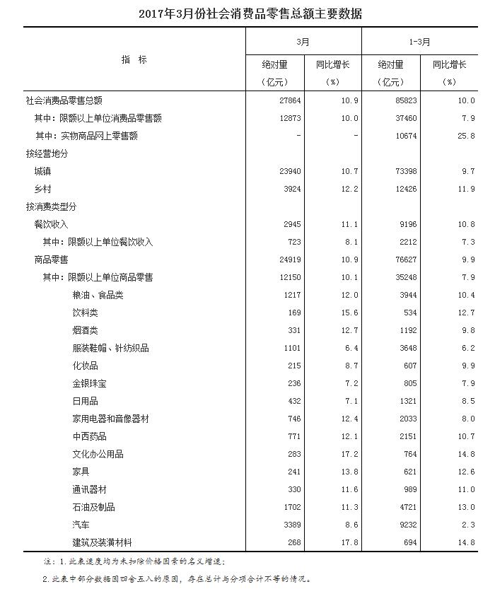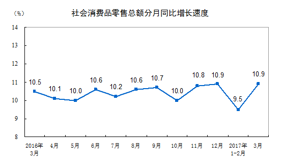 2017年3月份,社會消費品零售總額27864億元,同比名義增長10.9%。其中,限額以上單位消費品零售額12873億元,增長10.0%。
