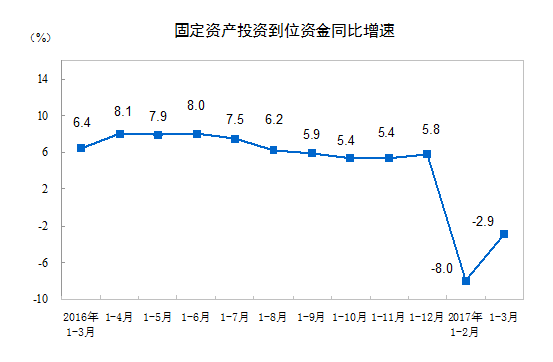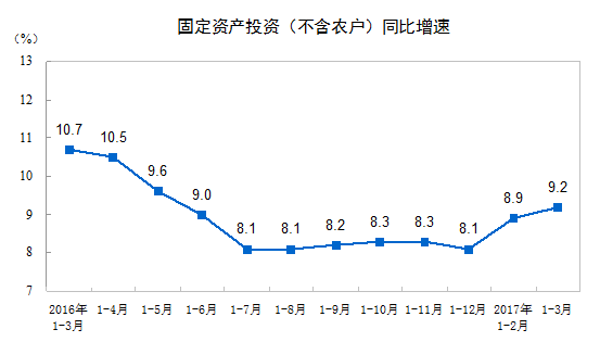 2017年1-3月份,全國(guó)固定資產(chǎn)投資(不含農(nóng)戶)93777億元,同比名義增長(zhǎng)9.2%,增速比1-2月份提高0.3個(gè)百分點(diǎn)。從環(huán)比速度看,3月份固定資產(chǎn)投資(不含農(nóng)戶)增長(zhǎng)0.87%。