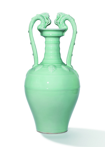 據(jù)介紹,此次重要拍品雍正粉青釉貼花雙龍盤(pán)口尊自五代后消失,至清雍正官窯復(fù)現(xiàn),雍正之后除乾隆早期尚有少量燒制外,之后又銷(xiāo)聲匿跡。雍正帝非常重視御制瓷器,常委托御窯廠制作仿古式樣,此雍正粉青釉貼花雙龍盤(pán)口尊仿唐朝傳瓶式樣,青翠瑩潤(rùn)的釉汁則仿照宋龍泉青瓷。雍正時(shí)景德鎮(zhèn)窯廠燒制的雍正粉青釉貼花雙龍盤(pán)口尊分兩種尺寸,第一種較小,約32厘米左右;第二種較大,約52厘米左右,拍品屬較大的一類(lèi),而要燒制如此龐大且器形復(fù)雜的瓶子難度極高,所以同類(lèi)傳世品少見(jiàn)。目前傳世的雍正粉青釉貼花雙龍盤(pán)口尊只有四件,本拍品是其中之一,亦是屬私人收藏里唯一品相完美的一件,另外三件分別藏沈陽(yáng)故宮博物院、美國(guó)克利夫蘭藝術(shù)博物館及加州陳氏典藏博物館。此尊源自曾為美國(guó)加州名流、女商人及慈善家Maruja Baldwin收藏,她的第二任丈夫Baldwin M.Baldwin是加州地產(chǎn)大亨E.J.(Lucky) Baldwin的孫兒,其家族是最早在加州發(fā)展的地產(chǎn)商及財(cái)團(tuán)之一,南加州多個(gè)地標(biāo)均是以此家族定名。此外,這件雍正粉青釉貼花雙龍盤(pán)口尊,曾于2004年在佳士得拍賣(mài)上亮相,并以17,423,750港元的成交價(jià)創(chuàng)下當(dāng)時(shí)的清代單色釉瓷器世界紀(jì)錄。