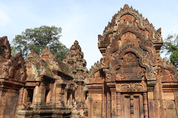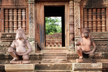 離開(kāi)吳哥窟,驅(qū)車向北約40分鐘左右就到了女王宮。雖然俗稱女王宮,其實(shí)這也是一座寺廟,但是與其他寺廟不同,它是由砂巖建造而成,通體呈朱紅色。這里的建筑比其他寺廟低矮許多,從門框、門楣,到挑檐、基座都無(wú)比華麗,精致繁復(fù)的浮雕無(wú)處不在,用作家蔣勛的話來(lái)講:“幾乎是以紡織刺繡的工法在做石雕,令人嘆為觀止?!?/p>