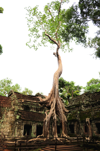 巴戎寺往東不遠(yuǎn)就是塔布隆寺,這座因好萊塢電影《古墓麗影》而名聲大噪的寺廟幾乎被叢林吞噬。廢棄數(shù)百年間,古樹(shù)早將神廟緊緊纏繞,樹(shù)的根莖穿繞在梁柱、屋檐、門窗之間,探入石縫,和廟宇融為一體,它們相互依靠,卻又彼此對(duì)抗。