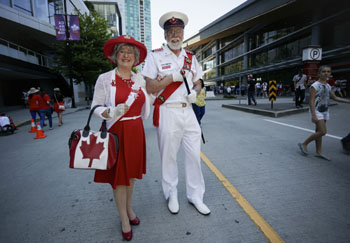 ??? 7月1日是加拿大國慶日,溫哥華當(dāng)日舉辦活動(dòng),慶祝加拿大建國150周年。 圖為一對老夫婦精心打扮參加國慶日活動(dòng)。新華社發(fā)(梁森 攝) |