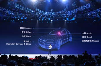 ??? 7月5日,百度AI開發(fā)者大會(huì)在北京國家會(huì)議中心舉行,近5000名開發(fā)者和生態(tài)合作伙伴參會(huì),百度在會(huì)上公布了完整的AI生態(tài)開放戰(zhàn)略。圖為百度集團(tuán)總裁兼首席運(yùn)營官陸奇發(fā)布百度Apollo開放平臺(tái)。記者 申宏 攝 |