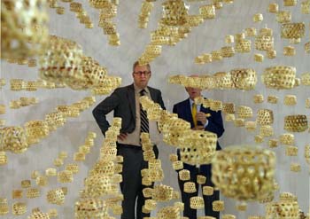 ??? 7月2日,2017上海夏季音樂節(jié)在上海交響樂團(tuán)開幕,圖為紐約愛樂樂團(tuán)執(zhí)行董事比爾·托馬斯(左)為2017上海夏季音樂節(jié)揭曉藝術(shù)裝置《夏音》?!断囊簟酚?400個(gè)傳統(tǒng)手工制作的蟈蟈籠子組成,以聲音喚醒樂迷對童年時(shí)夏天的回憶。記者 任瓏 攝 |