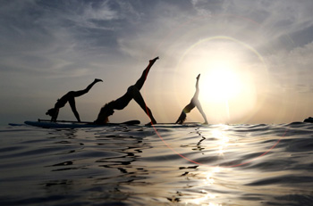 ??? 7月10日,在克羅地亞韋魯代拉,人們?cè)趤喌美飦喓_呑鰶_浪板瑜伽。新華社/路透 |
