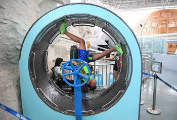 ??? 隨著暑假來(lái)臨,重慶科技館內(nèi)的科普演示裝置和互動(dòng)項(xiàng)目吸引眾多孩子參觀體驗(yàn),孩子們?cè)谳p松愉快的氛圍中學(xué)習(xí)科學(xué)知識(shí)、體驗(yàn)科學(xué)魅力。記者 王全超 攝 |