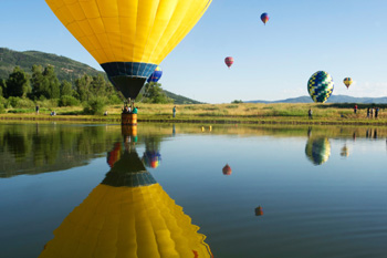 ??? 7月9日,在美國(guó)科羅拉多州的斯廷博特斯普林斯,一只參加比賽的熱氣球觸碰湖面。新華社/法新 |