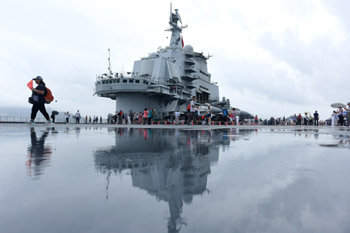 ??? 7月8日,香港市民在遼寧艦的飛行甲板上參觀。當(dāng)日,中國(guó)首艘航空母艦遼寧艦在香港開始向公眾開放。記者 秦晴 攝 |