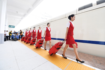 ??? 8月8日,在白城火車站,動(dòng)車列車員列隊(duì)上車。當(dāng)日,長(長春)白(白城)烏(烏蘭浩特)鐵路正式開通運(yùn)營。長白烏鐵路起自吉林省長春市,途徑吉林省松原市、大安市、白城市,止于內(nèi)蒙古自治區(qū)烏蘭浩特市,全長412公里,運(yùn)營時(shí)速160公里,是內(nèi)蒙古自治區(qū)首條跨區(qū)域動(dòng)車組列車運(yùn)行線路。記者 張楠 攝 |