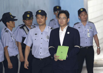 ??? 8月7日,在韓國首爾,三星電子副會(huì)長李在镕(前右)抵達(dá)首爾中央地方法院。就韓國三星電子副會(huì)長李在镕行賄前總統(tǒng)樸槿惠一案,檢察官7日建議首爾中央地方法院判處這名三星集團(tuán)實(shí)際“掌門人”12年監(jiān)禁。新華社/美聯(lián) |