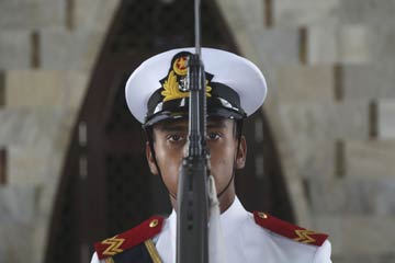8月14日,在巴基斯坦卡拉奇,一名海軍士兵在國父穆罕默德·阿里·真納的陵墓前警戒。當(dāng)日,巴基斯坦舉行系列活動(dòng),紀(jì)念獨(dú)立70周年。新華社/美聯(lián)?