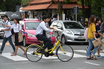 ?8月15日,在泰國曼谷的泰國國立法政大學(xué),一名學(xué)生使用ofo小黃車出行。中國共享單車品牌ofo小黃車近日進(jìn)駐泰國市場,首批6000輛ofo小黃車將逐步投放至泰國多所高校。記者 李芒?!z
