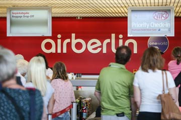 8月15日,在德國柏林泰格爾國際機(jī)場,乘客在柏林航空柜臺等候辦理登機(jī)手續(xù)。德國第二大航空公司柏林航空公司15日宣布,因大股東阿聯(lián)酋阿提哈德航空公司停止提供資金支持,公司運(yùn)營難以為繼,申請破產(chǎn)保護(hù)。在破產(chǎn)程序期間,柏林航空將依靠政府的過渡貸款維持運(yùn)營,現(xiàn)有航線照常。記者 單宇琦 攝?
