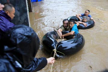 8月13日,在廣西柳州市融水苗族自治縣桿洞鄉(xiāng),救援人員轉(zhuǎn)移被洪水圍困的居民。連日來,受廣西融水苗族自治縣境內(nèi)以及上游持續(xù)強(qiáng)降雨影響,融江水位猛漲,融水縣城低洼地段被洪水淹沒,部分鄉(xiāng)鎮(zhèn)遭遇山洪。新華社發(fā)(龍濤 攝)?