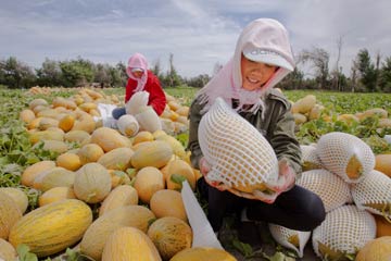 8月13日,新疆哈密巴里坤哈薩克自治縣三塘湖鎮(zhèn)的瓜農(nóng)收獲晚熟哈密瓜。連日來,三塘湖鎮(zhèn)千余畝晚熟哈密瓜陸續(xù)成熟,吸引眾多客商前來訂購。新華社發(fā)(普拉提 攝)?