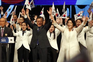 8月15日,在韓國首爾,韓國總統(tǒng)文在寅(前中)出席光復(fù)節(jié)72周年紀(jì)念活動(dòng)。文在寅15日呼吁和平應(yīng)對朝鮮半島核問題,表示韓方將竭盡全力阻止朝鮮半島發(fā)生戰(zhàn)事。記者 姚琪琳 攝?