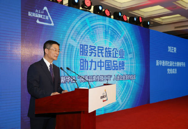 ↑2017年8月26日,在“民族品牌傳播工程”入選企業(yè)簽約儀式上,新華社副社長(zhǎng)兼秘書長(zhǎng)劉正榮發(fā)表講話。新華社記者 肖磊濤 攝