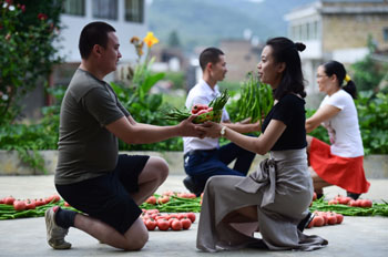 ??? 8月28日,在四川省敘永縣麻城鎮(zhèn)麻城村高山蔬菜基地,參加“浪漫采摘”活動獲勝的情侶在“蔬菜鵲橋”旁表達愛意。當日是七夕節(jié),麻城鎮(zhèn)舉辦七夕蔬菜采摘節(jié),吸引眾多情侶前來參加“浪漫采摘”“鵲橋獻愛”等趣味活動,以蔬菜為媒,表達愛意。新華社發(fā)(李欣 攝) |
