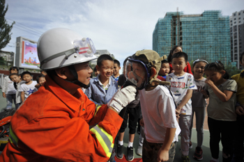 ??? 8月28日,河北承德南營子小學學生在消防戰(zhàn)士指導下體驗消防器材。當日,南營子小學聯(lián)合當?shù)叵来箨犻_展消防安全教育“開學第一課”。學生們在消防官兵的指導下體驗使用消防器材,參加消防逃生演練,提升消防安全意識和自救能力。新華社發(fā)(王立群 攝) |