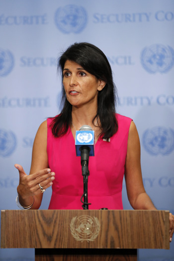 ??? 8月25日,在位于紐約的聯(lián)合國總部,美國常駐聯(lián)合國代表妮基·黑莉向媒體發(fā)表講話。黑莉說,國際原子能機構(gòu)應“傾盡其職權(quán)”對伊朗核設施進行檢查,并表達美國對這一進程的支持。記者 李木子 攝 |