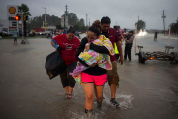 ??? 8月28日,在美國得克薩斯州休斯敦,人們從家中撤離后轉(zhuǎn)移到高地。截至當?shù)貢r間28日晚,至少11人在颶風“哈維”引發(fā)的災害或事故中死亡。隨著休斯敦地區(qū)積水面積不斷擴大,近6000人主動前往或被營救至臨時避難所。新華社/路透 |