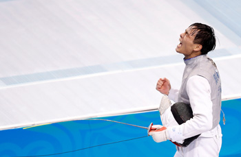 ??? 8月29日,陳海威慶祝勝利。當日,在天津舉行的第十三屆全國運動會男子花劍個人賽決賽中,福建選手陳海威以15比9戰(zhàn)勝香港選手崔浩然,獲得冠軍。記者 王麗莉 攝 |