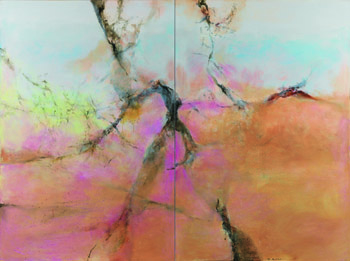 《24.12.2002-雙聯(lián)作》一股柔和而具有律動(dòng)的能量充盈于此巨幅雙聯(lián)畫作,微妙的色彩層次的視覺(jué)感非常豐富:上方一抹湖藍(lán)色與下方的梅紅色以及大面積的暖褐色融合為背景色。這與趙無(wú)極早期作品著重用筆的力度及油彩的厚重方式不同,此作品不但探索了色彩,光線及用色的巧妙運(yùn)用,更是散發(fā)出輕盈的氣息以及由畫布自內(nèi)向外散發(fā)的柔和光芒。這種對(duì)于輕盈、抽象的空間的追尋,契合大膽的色彩運(yùn)用正是趙無(wú)極在晚期創(chuàng)作所追尋的和諧點(diǎn)。趙無(wú)極的藝術(shù)成就不僅在于他在西方抽象藝術(shù)發(fā)展中開創(chuàng)了其獨(dú)特具有東方美學(xué)的藝術(shù)風(fēng)格,更是他將中國(guó)哲學(xué)的深刻洞見(jiàn)與創(chuàng)造性詮釋于藝術(shù)創(chuàng)作之中,這條東西美學(xué)融合的艱難探索之路,不但在世界藝術(shù)史發(fā)展中留下精彩的篇章,亦是藝術(shù)家回歸內(nèi)在本源。佳士得亞洲二十世紀(jì)及當(dāng)代藝術(shù)資深專家莊俊表示:“作為世界藝術(shù)舞臺(tái)上最耀眼的華人藝術(shù)大師之一,趙無(wú)極豐富的繪畫語(yǔ)言與筆觸不斷帶給我們驚喜與感動(dòng)。此件由歐洲征集的藝術(shù)家晚期代表作品更為本季秋拍增添更多色彩和分量。與此同時(shí),本專題將呈現(xiàn)數(shù)件趙無(wú)極不同時(shí)期油畫和紙上等精甄之作?!?/p>
