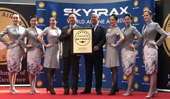 全球航空公司與機場服務權威調(diào)研機構SKYTRAX主席Edward Plaisted向海南航空總裁孫劍鋒頒發(fā)五星航空公司獎牌