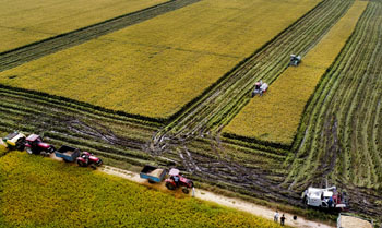 ??? 9月17日,安徽霍邱縣范橋鎮(zhèn)種糧大戶戚仁杰組織收割機收獲水稻。地處淮河南岸的霍邱縣是產糧大縣,今年全縣195萬畝水稻豐收在望。種糧大戶、范橋鎮(zhèn)雙元村村民戚仁杰2010年流轉1200多畝淮河行洪區(qū)的水田,成立眾樂糧食種植專業(yè)合作社,進行全機械化作業(yè),連年取得好收成,今年畝產達到700多公斤,總產糧食700多公斤,總產糧食80多萬公斤。記者 陶明 攝 |